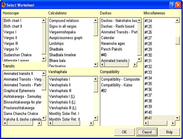 Parashara's Light 7.0 supports 300 different worksheets. Any of these worksheets can be configured in landscape mode or portrait mode (for printing). Out of these 300, about 100 are predesigned when you install the update.